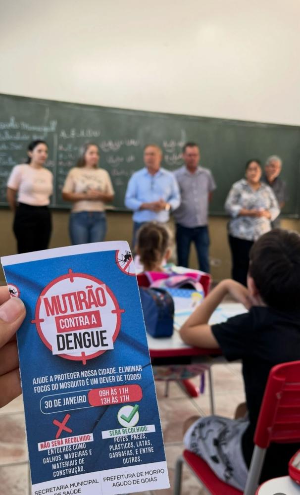 Em uma ação estratégica de conscientização e combate à dengue, a Prefeitura de Morro Agudo de Goiás, por meio de uma comitiva liderada pelo executivo municipal, visitou nesta segunda-feira, dia 27, a Escola Municipal Sebastião José de Sá e a Escola Municipal Sinval de Souza Ramos. O objetivo foi entregar o comunicado oficial sobre o grande Mutirão de Limpeza contra a Dengue, agendado para a próxima quinta-feira, dia 30.